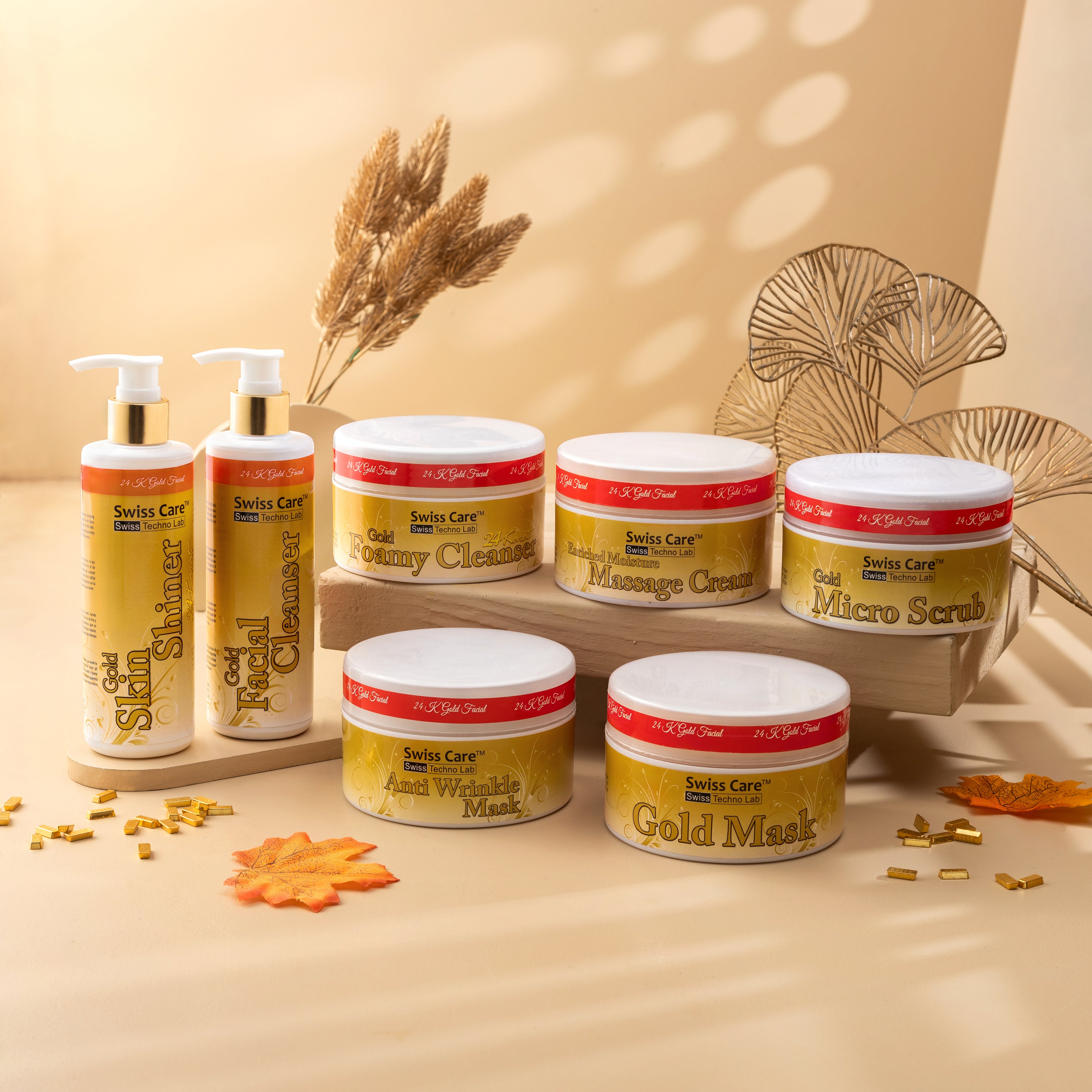 • Gold Facial Cleanser: Softens, hydrates, and lightly exfoliates for smooth and bright skin.
